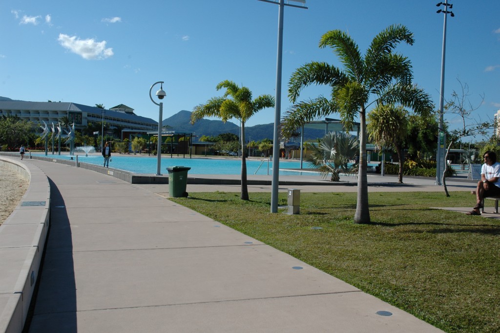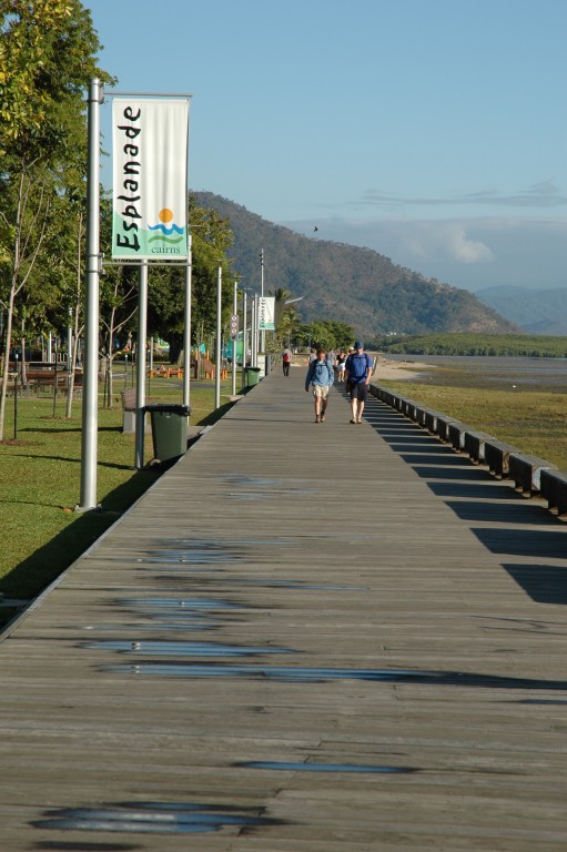 Strandpromenade Ich bin angenehm überrascht. Das Zimmer ist ungefähr so groß wie mein Wohnzimmer in Hannover, wenn nicht größer, und hat auf den ersten Blick alles, was man so braucht. Kühlschrank, Klimaanlage, Fernseher, Wasserkocher, Toaster, Fön, Handtücher... Ich mache die Klimaanlage an, falle auf das Bett und schlafe drei Stunden lang. War wohl nötig. Nach einer Dusche fühl ich mich ausgeschlafen und studiere erst einmal eine Weile meinen Reiseführer. Außerdem gab es am Flughafen und bei Avis jeweils eine Broschüre mit allerlei Aktivitäten in Cairns - wo soll man da nur anfangen? Nach reiflicher Überlegung denke ich, dass eine Bootsfahrt zum Great Barrier Reef wohl obligatorisch ist. Kuranda klingt auch nett - ein kleines Dorf in den Bergen, eine knappe Autostunde entfernt -, aber es ist wohl schon ein bisschen spät dafür. Mal schauen. Ich schaue an der Rezeption vorbei, sage Bescheid, dass ich eine weitere Nacht bleiben möchte und frage nach einer Bootsfahrt zum Riff. Sie empfiehlt mir spontan eine, legt mir aber noch fünf weitere Prospekte vor. Keine Ahnung, was man da nehmen soll; der erste Vorschlag ist mit 60 Dollar am billigsten und klingt so, als hätte er alles, was man braucht. Zumal die Rede von einem Glasbodenboot ist und ich denke, dass ich eh nicht schwimmen kann mit meiner Schulter. Sie ruft freundlicherweise für mich dort an und bucht den Ausflug. Ich spüre einen kleinen Hunger und fahre mit dem Auto die