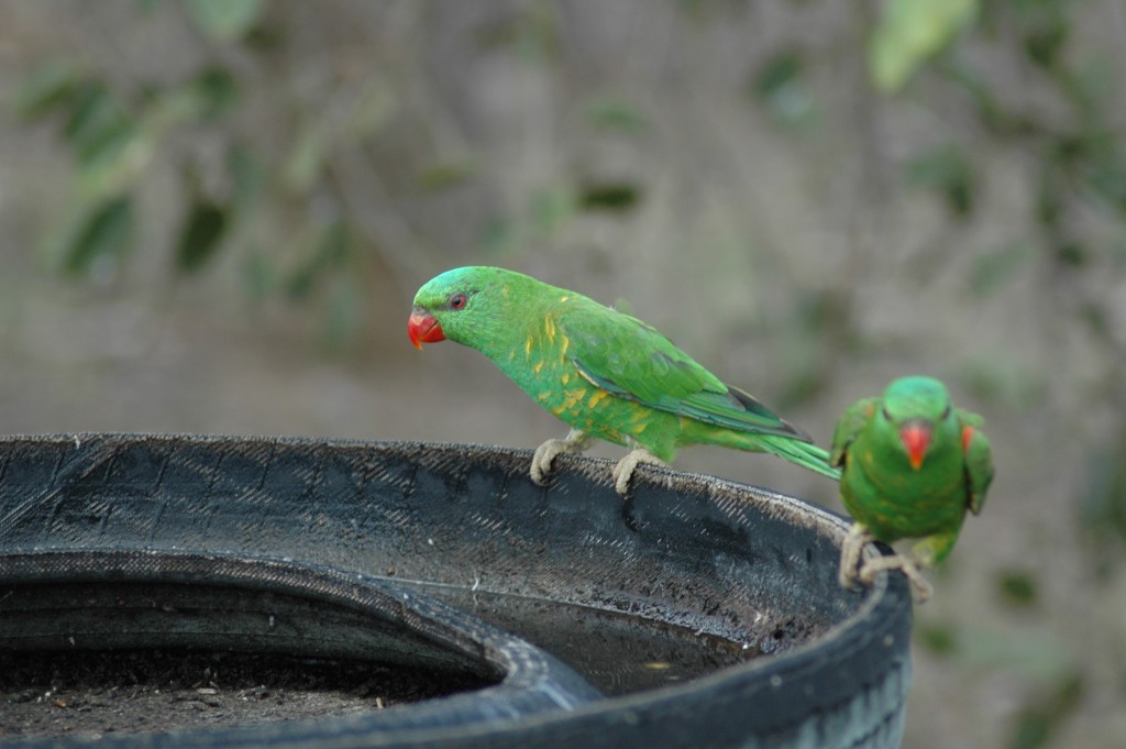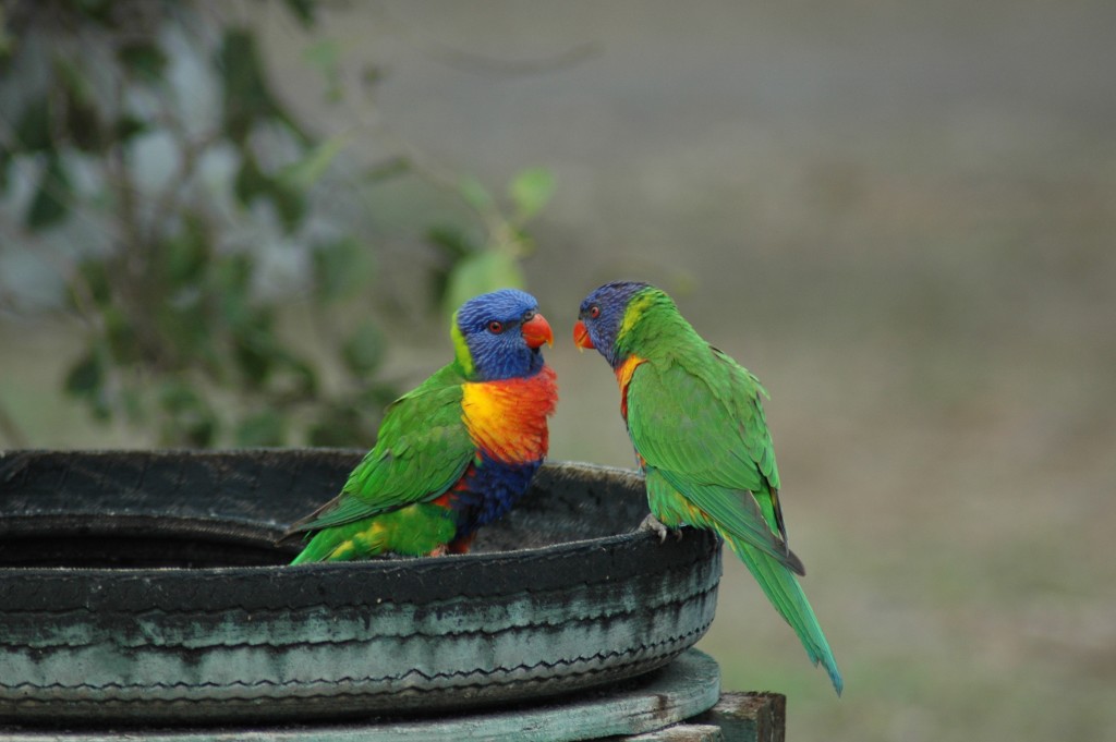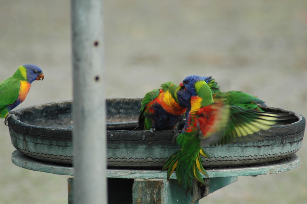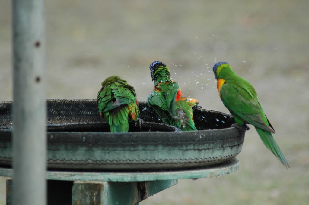 Lorikeets, und daneben steht eine Vogeltränke, in der die