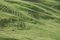 Hügel, auf manchen grasen Schafe, auf anderen Rinder. Ich
