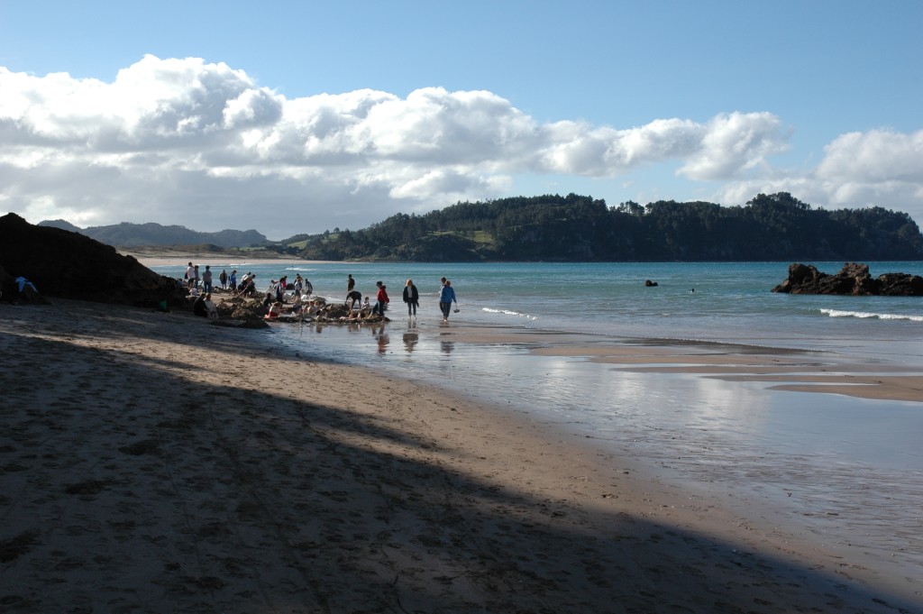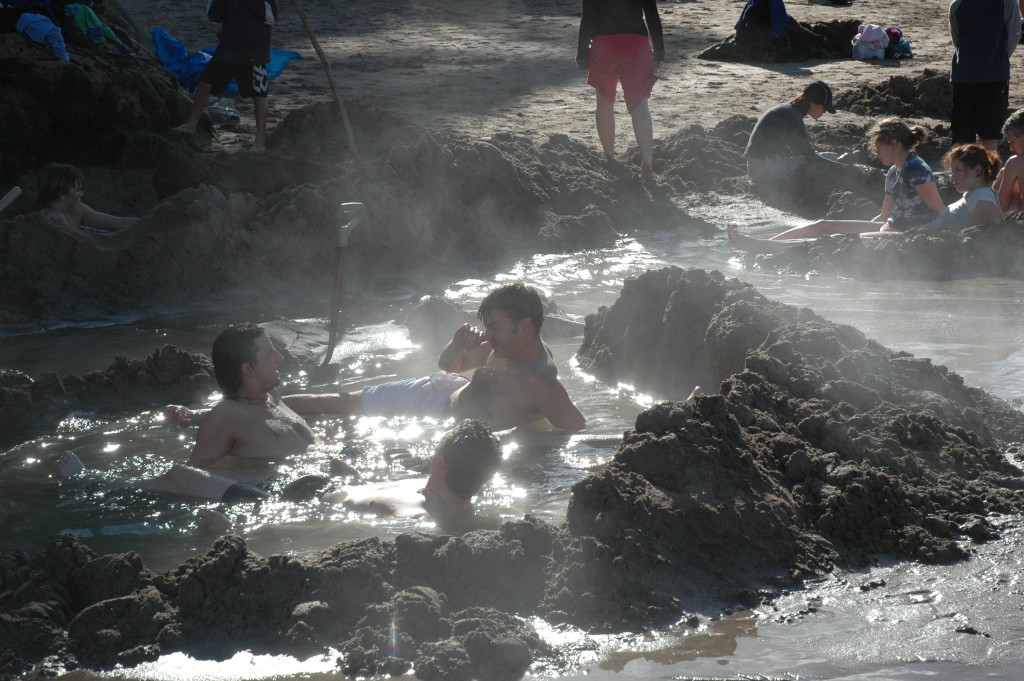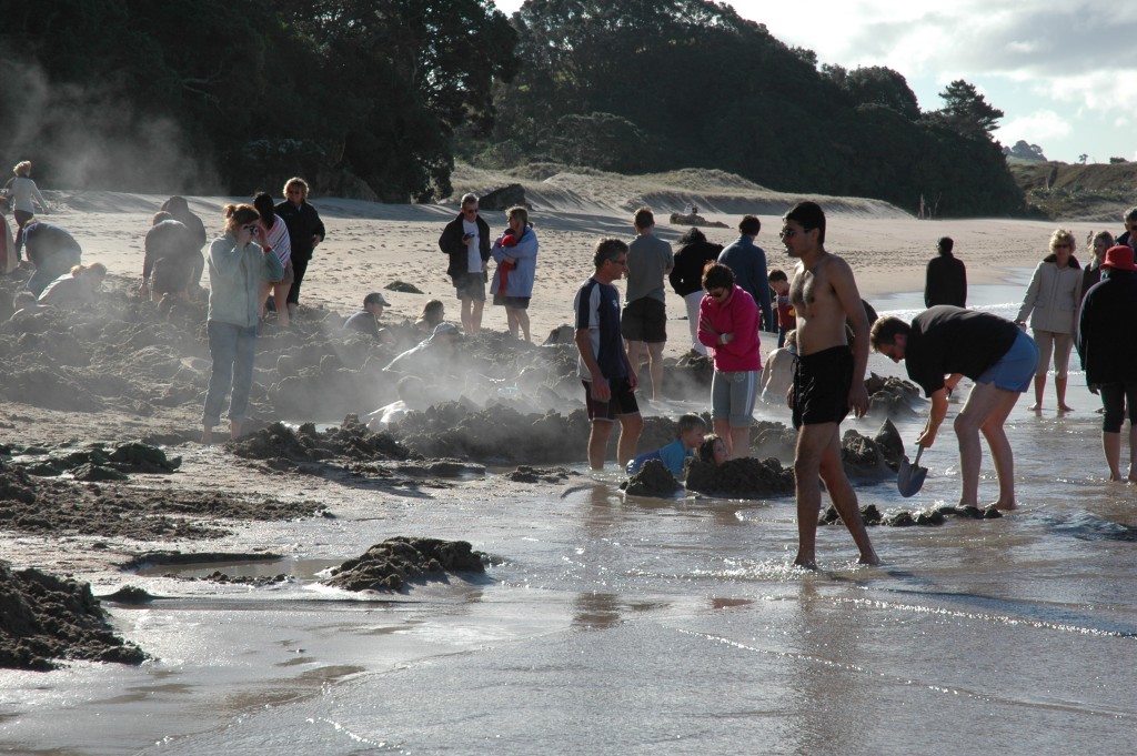 dass ich genau richtig gegen 15:00 am Hot Water Beach ankomme, wo ich