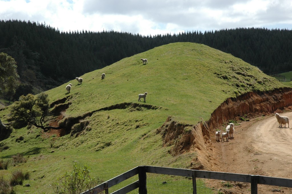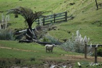 Ich schlafe sehr gut in meinem kleinen Bettchen - es muss nicht immer King Size sein. Über die Sauberkeit von Dusche und Toilette kann man auch nicht meckern; nur, dass man im Schlafanzug über den Gang gehen muss (oder sich vor dem Duschen vollständig ankleiden, aber das kommt ja auch nicht wirklich in Frage). Und natürlich muss ich mein eigenes Handtuch benutzen, das hinterher nass ist. Man kann sich natürlich kein Frühstück aufs Zimmerchen bestellen, und Kaffee könnte man sich auch nur kochen, wenn man welchen mitgebracht hätte. Das sind so die kleinen Unterschiede im Komfort zwischen 25 Dollar für dies hier und 60 Dollar aufwärts, die man so für Motels bezahlt. Ich früchstücke um 10 in einem Cafe und beschließe, mich heute auf dem Weg nach Rotorua nicht weiter aufhalten zu lassen. Lediglich ein Örtchen namens Okere Falls lässt mich vermuten, dass es dort vielleicht Wasserfälle geben könne; dort will ich mal anhalten. Außerdem habe ich mir für heute das Projekt Schaf vorgenommen. Ich habe nämlich festgestellt, dass ich zwar tagtäglich Schafe auf diesen wunderhübschen grünen Hügeln weiden sehe, aber noch keine wirklich fotografiert habe. Halte also die ganze Fahrt über Ausschau nach erstens Schafen, die zweitens ein bisschen im Gegenlicht, drittens auf einem halbwegs dekorativen Hügel, viertens nahe bei der Fahrbahn stehen sollten und bei denen man fünftens auch irgendwo in der Nähe anhalten kann. Eine ganze Menge Bedingungen, die ich tatsächlich schon nach