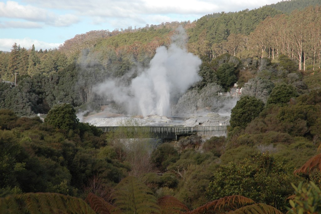 gebracht wäre Als ich nach Rotorua reinfahre, beginnt es verbrannt zu riechen, und ich mache mir schon Sorgen um mein Auto. Nein, eigentlich nicht verbrannt, sondern nach Schwefel, ach ja, natürlich! Ich wusste ja, dass die Gegend vulkanisch aktiv ist, vor heißen Quellen, Geysiren und dergleichen nur so wimmelt. Deshalb bin ich schließlich hergefahren. Aber dass man es schon im Auto riecht, wenn man in die Außenbezirke der Stadt reinfährt, das hätte ich nicht gedacht. An der Touristen-Info frage ich, was man sich denn so anschauen soll, wenn man an Natur, Geysiren und dergleichen interessiert ist. Dort ist ziemlich viel los, und etwas hektisch empfiehlt man mir, das Maori Arts & Crafts Institute. Klingt nicht sehr vulkanisch für mein Ohr, aber doch doch, dahinter sei ein großes Thermalgebiet mit mehreren Geysiren. Na dann los. Sie wollen dort 20 Dollar Eintritt, was ich recht happig finde, zumal mir eigentlich erstmal nicht nach Maori-Kultur ist, sondern ich die Geysire sehen will. In Amerika im Yellowstone National Park musste man für die Natur keinen Eintritt zahlen. Ich überwinde mich aber doch, zu bezahlen, und bekomme das Gewünschte zu sehen. Den Maori-Kram lass ich erstmal links liegen; den kann ich nach Sonnenuntergang beziehungsweise bei schlechterem Licht immer noch anschauen, denke ich mir. Ich sehe schon von weitem, wofür ich gekommen bin: einen