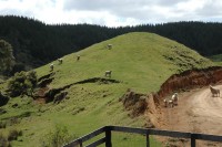 Übersichtsfoto vom grünen Hügel Ich kullere gemütlich die Straßen entlang und denke mir wieder einmal, dass man hier doch deutlich langsamer vorankommt, als man so denkt. Weil die Gegend total hügelig ist und sich die Straßen andauernd Berge rauf und runter winden. Dass man mal geradeausfahren und die Geschwindigkeitsbegrenzung auf 100 km/h tatsächlich ausschöpfen kann, ist eine Seltenheit. Kurz hinter Te Puke kommt von hinten ein Polizeiauto angefahren, mit Blau- und Rotlicht und blinkenden Scheinwerfern. Ich gehe etwas vom Gas und halte mich ganz links, aber es will nicht überholen. Dann plötzlich das Deja vu: Sollte der mich meinen? Ich bin 1992 in Amerika auch schon einmal von der Polizei angehalten worden, weil ich angeblich 60 statt der erlaubten 35 gefahren sein soll *hüstel*. Aber heute? Ich bin doch hier in Neuseeland quasi das wandelnde Verkehrshindernis; immer schön brav langsam, meist langsamer als das Tempolimit und oft mit einem kleinen Stau Einheimischer hinter mir. Ich halte also an, und der Polizist klärt mich darüber auf, dass ich tatsächlich 83 gefahren sein soll in einer 70-Zone. Au Backe. Ich kann es mir kaum vorstellen; außer, er hat wirklich direkt hinter dem Schild gehockt und ich war noch nicht ganz langsam genug, aber egal. Was will ich widersprechen, wenn er das gemessen hat. Habe ja keinen Fahrtenschreiber an Bord, um das Gegenteil zu beweisen. Also versichere ich ihm brav, dass es mir leid tut, wo denn das genau gewesen sei, dass ich womöglich gedacht habe, die Geschwindigkeitsbegrenzung wäre schon vorbei. Er fragt mich, ob ich ein Tourist sei, und als ich bejahe, ob ich nach Rotorua wolle. Ja, genau. Auf dem Weg dorthin gebe es noch eine ganze Menge verschiedener Geschwindigkeitsbegrenzungen, und ich solle doch genau darauf achten, wo sie anfangen und aufhören. Sonst müsste man mir möglicherweise einen Strafzettel verpassen und mir Punkte von meinem Führerschein abziehen, und das wäre doch nicht schön in den Ferien. In der Tat. Also lässt er mich laufen, da bin ich ja jetzt doch erleichtert. Zumal ich vorbildlich langsam Auto fahre hier in Neuseeland; die Landschaft ist einfach zu schön, um an ihr vorbeizurasen. Hier jetzt einen Strafzettel zu kriegen, wäre wirklich ungerecht gewesen, auch wenn ich vielleicht mal etwas zu spät gebremst habe bei so einem doofen Schild oder am Ende einer Ortschaft etwas zu früh Gas gegeben. In Okere Falls sehe ich aus dem Augenwinkel ein winziges braunes
