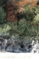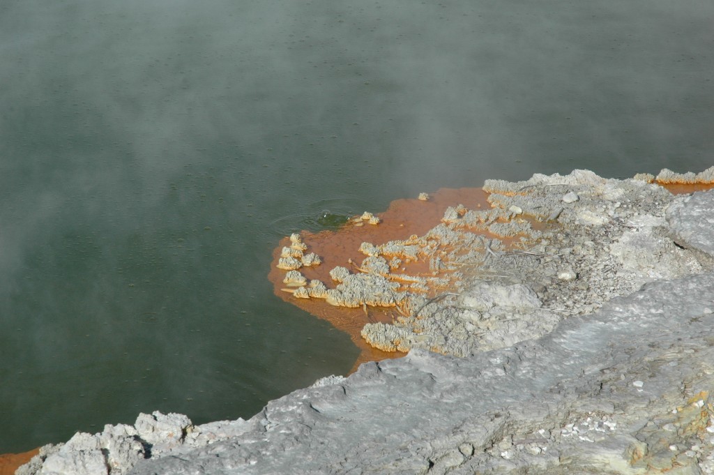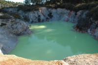 hinterhertollen Das Waiotapu Thermal Wonderland habe ich mir fest vorgenommen. Nicht nur schwärmt mein Reiseführer davon, der Mensch in dem Motel gestern hat es mir auch ans Herz gelegt, und der Flyer sieht nicht schlecht aus. Wirkt allerdings ebenso kommerziell, aber egal. Mud Pools, Geysire und ganz viele Farben... das will ich auf jeden Fall sehen. Die Mud Pools liegen noch vor dem Eingang und sind somit ein kostenloses Vergnügen. Blubbern deutlich heftiger als die von gestern, ansonsten sind sie halt grau. Und es stinkt ganz furchtbar nach Schwefel; das wird es wohl die nächsten Stunden auch noch tun. Wie erwartet, kostet das Wunderland Eintritt, und zwar 18,50, und den Geysir habe ich verpasst. Den gibts nämlich jeden Tag um 10:15. Was mir schon komisch vorkommt, woher wissen die das? Ok, der Old Faithful im Yellowstone hält seinen Stundentakt auch ziemlich genau ein, wenn ich mich recht erinnere. Der Park ist perfekt ausgebaut, mit schönen Wegen, Bänken