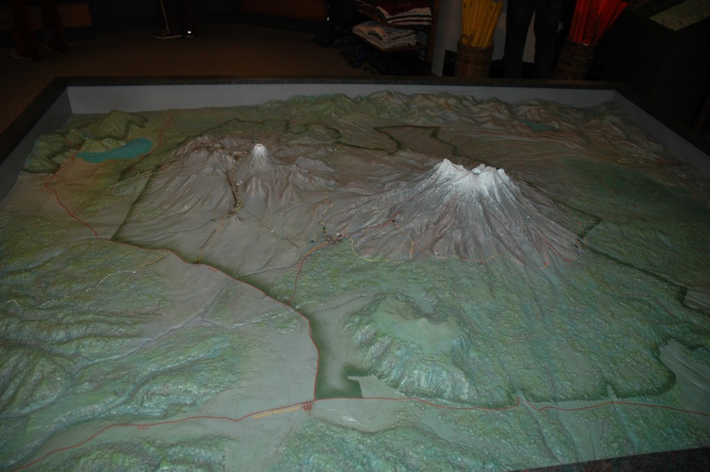 Am Horizont sehe ich jetzt schneebedeckte Berge, die Vulkane Mt.