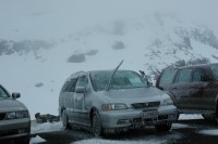 Schneeschauer. Oben in Whakapapa ist das Skigebiet geschlossen, die