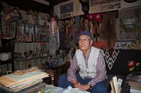 mich in seinem Souvenir-Zimmer, das vollgestopft ist mit Mitbringseln