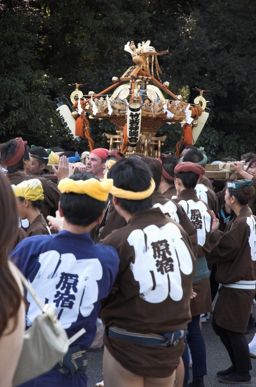 einer Menschenmenge wird ein mikoshi getragen Wir beschließen, am Kombini ein bisschen was zu essen und