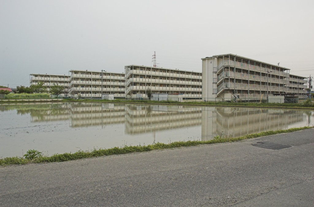 typischen kleinen Einfamilienhäuschen und dazwischen Reisfelder; auf