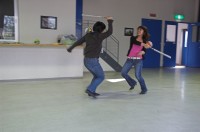 Schwertern aus zusammengerolltem Zeitungspapier treten wir