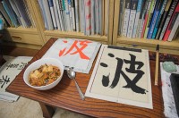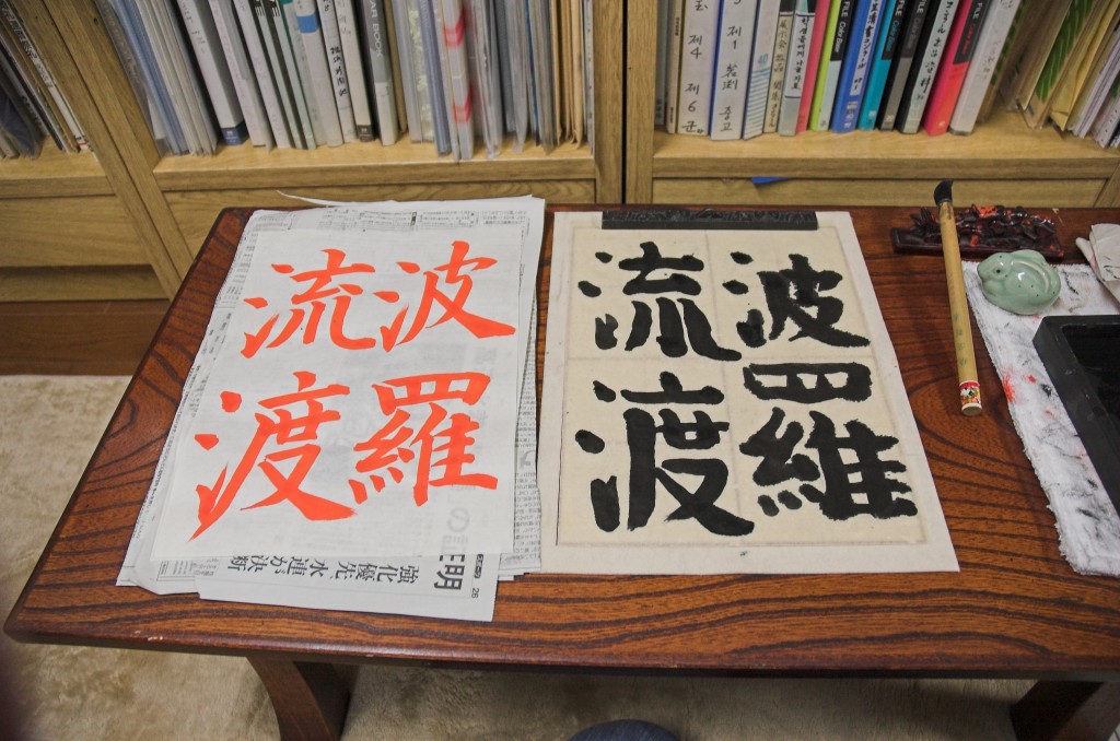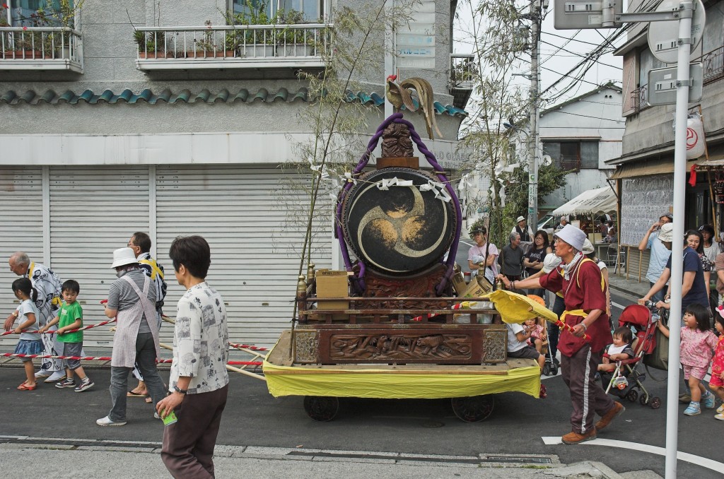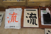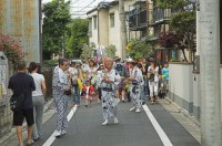 Eigentlich hatte Chandra mir angekündigt, dass er heute morgen ins Fitness-Studio wolle und wir uns irgendwo in der Stadt treffen würden. Aber als ich um 10 aus meinem Zimmer luge, ist die Wohnzimmertür noch zu und seine Schuhe stehen noch da. Also lege ich mich wieder hin und wir stehen erst um 11.30 auf. So viel zum Thema gegen 13 Uhr bei der Kalligraphie-Meisterin sein. Bis wir mit den diversen Bussen und Bahnen bis Akabane gekommen sind, ist es 15 Uhr. Auf dem Weg dahin begegnen uns zwei kleine Umzüge: Trommeln auf