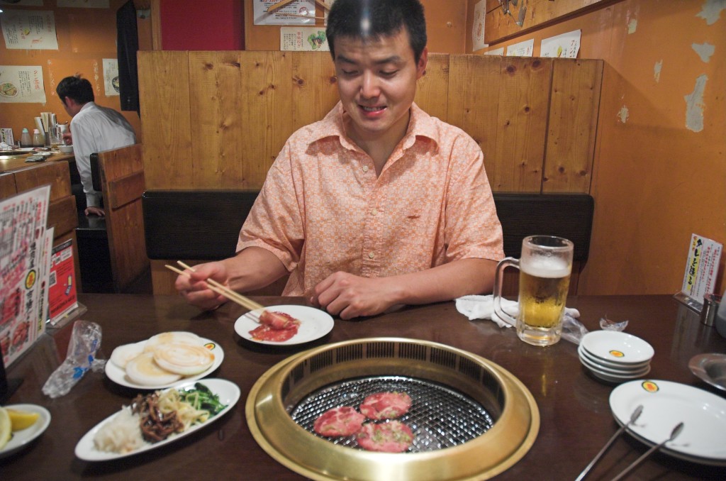 Es ist koreanisch, mit einem im Tisch eingelassenen Grill, auf dem wir