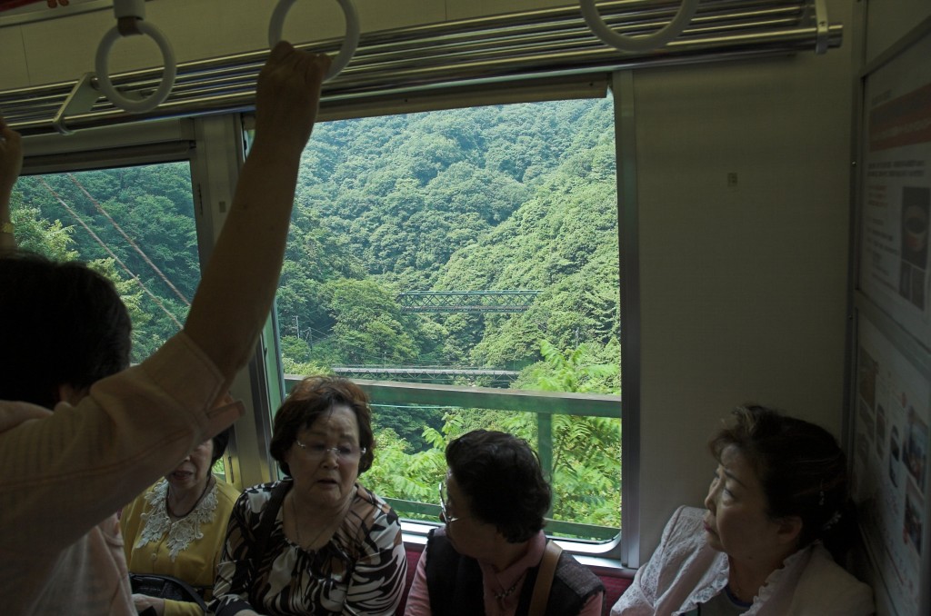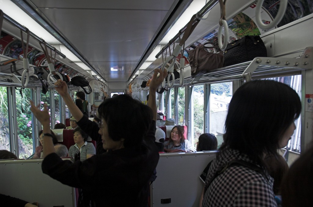 Eigentlich wollte ich heute nach Nikko fahren, ein laut allen Reiseführern und auch Hiko sehr sehenswerter Ort 130 km nördlich von Tokyo. Ich bin zwar vor 9 aufgestanden und fühle mich sehr fit, verbringe aber so viel Zeit mit der Recherche, wie ich da hinkommen könnte, dass ich zu dem Schluss komme, dass es sich nicht mehr lohnt. Wenn ich super schnell mache, kann ich allerfrühestens um 14 Uhr dort sein, und um 18 Uhr wird es schon wieder dunkel. Und wer weiß, ob ich all diese Verbindungen so erwische. Also beschließe ich, ein anderes lohnenswertes Ziel anzuvisieren, das etwas näher liegt: Hakone. Das ist ein Ort im Gebirge mit einem Nationalpark drumrum, in dem es viele heiße Quellen gibt, ach lest selbst in der Wikipedia. Da ich schon südlich von Tokyo wohne und somit schon näher dran bin, wird sich das eher lohnen. Bis ich mir alles überlegt und geduscht habe, ist es doch schon wieder kurz vor 11, als ich aus dem Haus gehe. Sollte ich mal nach Nikko wollen, muss ich wirklich mal viel früher aufstehen. Oder es als Zwei-Tages-Tour mit Übernachtung planen. Im Zug nach Odawara sieht man endlich mal etwas anderes als nur