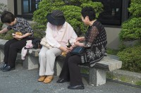 in den hintersten Winkel (oku) von Yumoto bringt Da ich es auf den letzten Bus um 20.47 nicht ankommen lassen will und mir das ohnehin ein bisschen spät wird, fahre ich um 19.47 wieder zurück nach Yumoto. Jetzt was essen, das wärs! Aber in Bahnhofsnähe scheint es rein gar nichts zu geben, alle Bürgersteige hochgeklappt. Ich meine mich zu erinnern, dass so etwas in meinem Reiseführer stand: Man quartiert sich hier in einem Ryokan ein und isst dann dort, weil die Restaurants um 8 zumachen. Tatsächlich, nichts zu essen in Sicht. Also fahre ich mit knurrendem Magen nach Hause, um dann um kurz vor 10 in Kinougaoka in einem kleinen Yakitori-Laden einzukehren in der Nähe des Bahnhofs. Diesmal habe ich keinen Hiko, der für mich bestellen könnte, und lesen kann ich wieder mal nix. Also bitte ich sie, mir einfach irgendetwas zu empfehlen. Was es denn gibt, vielleicht Huhn und Rind? Mit amüsiertem Lächeln erklärt sie mir, dass hier alles Hühnerfleisch sei (ich Dussel, ja, die beiden Zeichen Yaki und Tori heißen grillen und Huhn, Mann, bin ich müde). Ob ich denn Leber mag? Gut, dass sie gefragt hat, das nun ausgerechnet nicht. Also serviert man mir diverse Spieße; erst welche mit ganz normalen Hühnerfleisch mit Zwiebeln, dann anscheinend Haut und schließlich etwas recht Zähes, Knorpeliges, wahrscheinlich Gedärme, will ich gar nicht wissen. Eher für Fortgeschrittene. Alles in allem aber sehr lecker. Und relativ schnell werde ich von den Umstehenden in ein Gespräch verwickelt. Wo ich denn herkomme, wie lange ich in Japan bin, was ich hier mache und so weiter. Der Mann neben mir fragt mich, ob ich Tofu mag, und als ich bejahe, bestellt er eine Schüssel gebratenen Tofu mit – so denke ich – Flocken aus getrocknetem Thunfisch und gibt mir die Hälfte ab. Danke, sehr freundlich! (Die Erinnerungsfotos an diesen Abend entstehen mit der Handy-Knipse und erscheinen nur drüben im Live-Foto-Log.) Und wieder einmal habe ich den letzten Bus um 22.15 Uhr verpasst und muss eine gute halbe Stunde lang nach Hause laufen. Puh! |