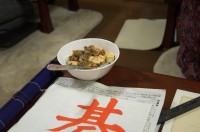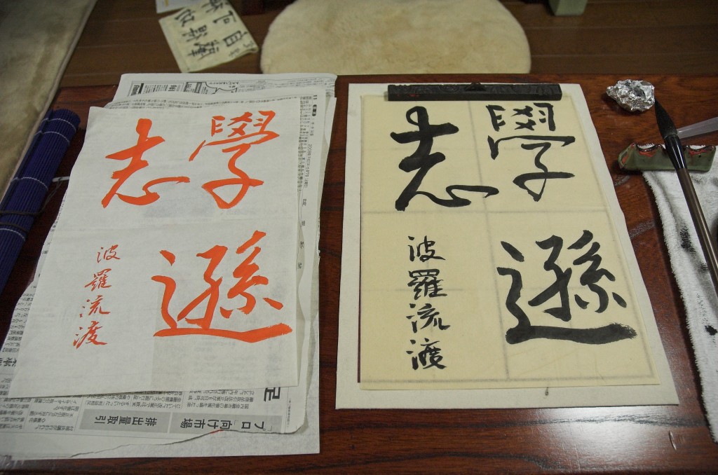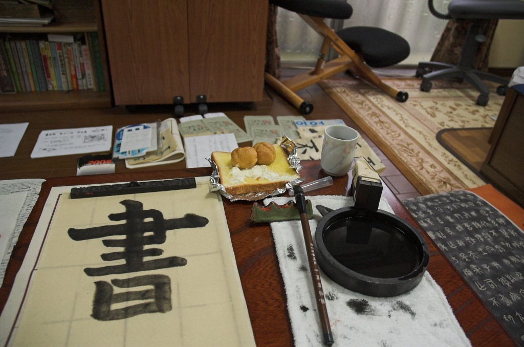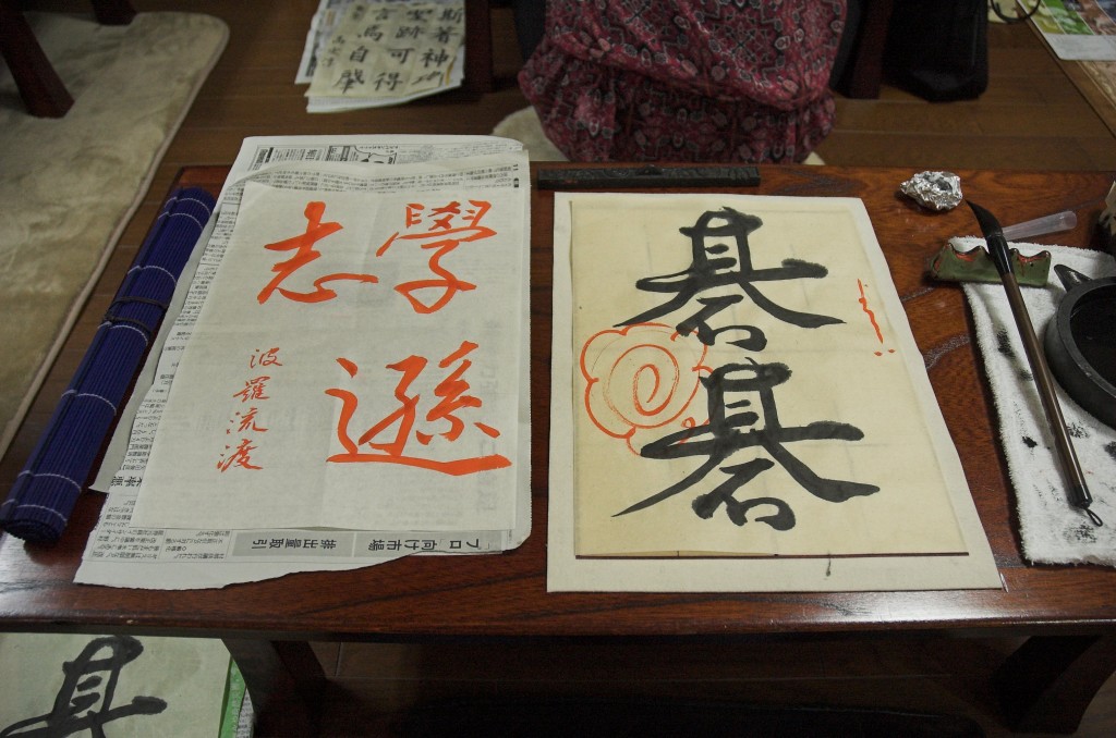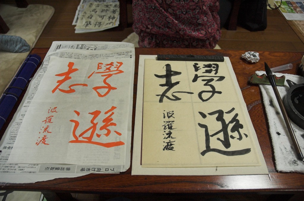 Nach abermals viel Schlaf scheint die Japangrippe heute weitegehend ausgestanden zu sein, zum Glück. Heute steht nämlich wieder ein Highlight meiner Reise an, Kalligraphieunterricht. Das ist mir vor allem deshalb so wichtig, weil ich in Deutschland immer noch keinen Lehrer gefunden habe. Ich muss also schauen, dass ich so viel wie möglich aus Japan mitnehme, denn zu Hause bleibt mir bis auf Weiteres nur das Selbststudium. Und ich möchte das wirklich lernen, finde es total faszinierend! Chandra und ich lassen den Tag langsam angehen und machen uns erst gegen 14 Uhr auf die Reise, sodass wir erst um 16 Uhr bei der Meisterin eintreffen. Ich sage ihr heute, dass mir irgendwie noch nicht klar ist, wie ich einem Kanji ansehe, welcher Strich in welchem Stil zu sein hat. Die waagerechten beispielsweise enden manchmal mit so einem resoluten Knubbel, oft aber auch nicht. Und bei einem Zeichen wie aka (rot) sind die letzten vier Striche alle verschieden, woher weiß man, welcher welcher ist? Ok, üben wir das nochmal am Zeichen sho (schreiben, erstes