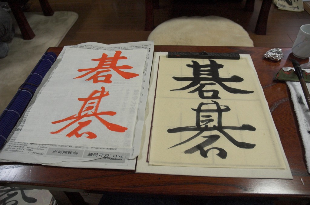 Tee Als die Meisterin wieder Zeit für mich hat, habe ich etliche Blätter mit sho vollgemalt und sie ist sehr zufrieden. Ich bitte sie, ob ich mich vielleicht als Nächstes mal an dem Schriftzeichen für Go versuchen darf. Kann mir als Go-Spieler bestimmt nicht schaden, wenn ich dieses Zeichen schön schreiben kann. Sie zeigt es mir aber überraschenderweise nicht nur in dem Blockschrift-artigen Schreibstil kaisho, den ich bisher praktiziere und mit dem sich Anfänger dem Vernehmen nach lange Zeit auseinandersetzen, bevor sie die höheren Weihen erlangen, sondern auch in gyousho, der Semikursivschrift, in der die Linien fließender, die Zeichen aber trotzdem noch halbwegs lesbar sind. Nach meinem ersten, ziemlich lausigen Versuch, die beiden Stile auf
